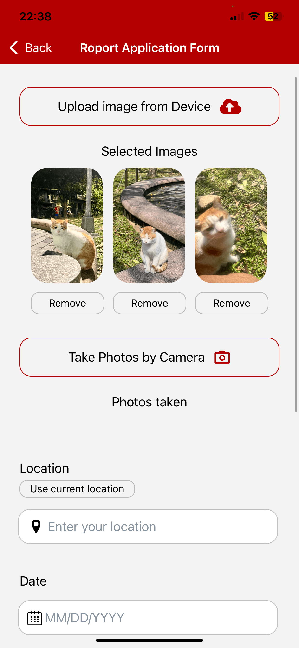 Report page utilizes the functionality of mobile device — camera and media library. Users can either take picture in real time or upload images from their mobile device.