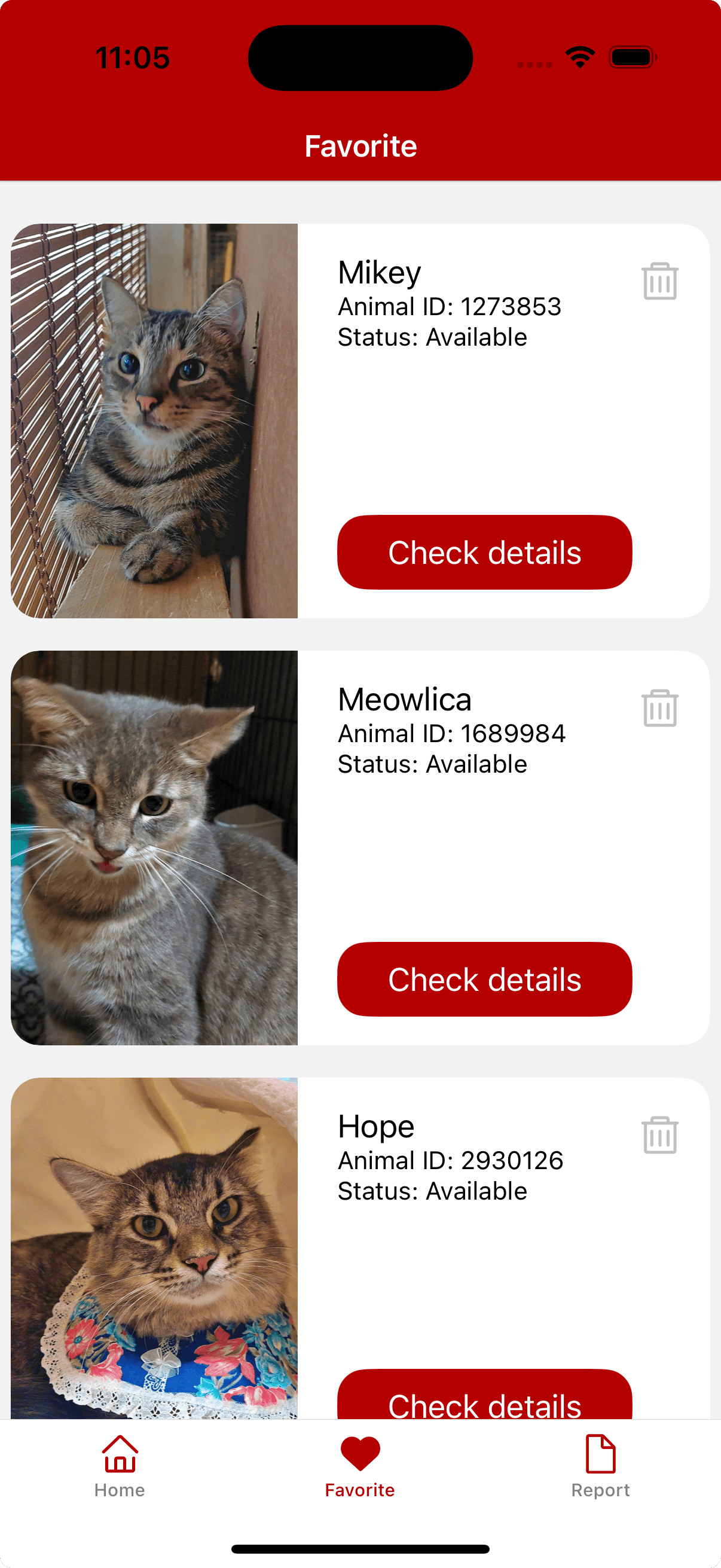 Shows the detailed individual animal information including basic information such as name, color, size, and age, and pictures. The animal profile page also serves as the starting point for the adoption application process.