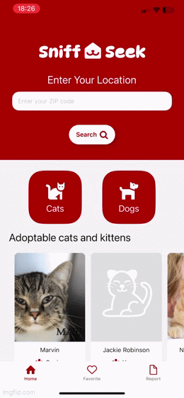 Sniff and Seek is a 4-week long individual project designed to help people find adoptable animals from nearby shelters. This project required skills in handling data from APIs, managing data flow between functional components, leveraging React Hook, utilizing mobile app functionalities, and presenting data on the front end with a user-centered, user-friendly, and visually appealing design.